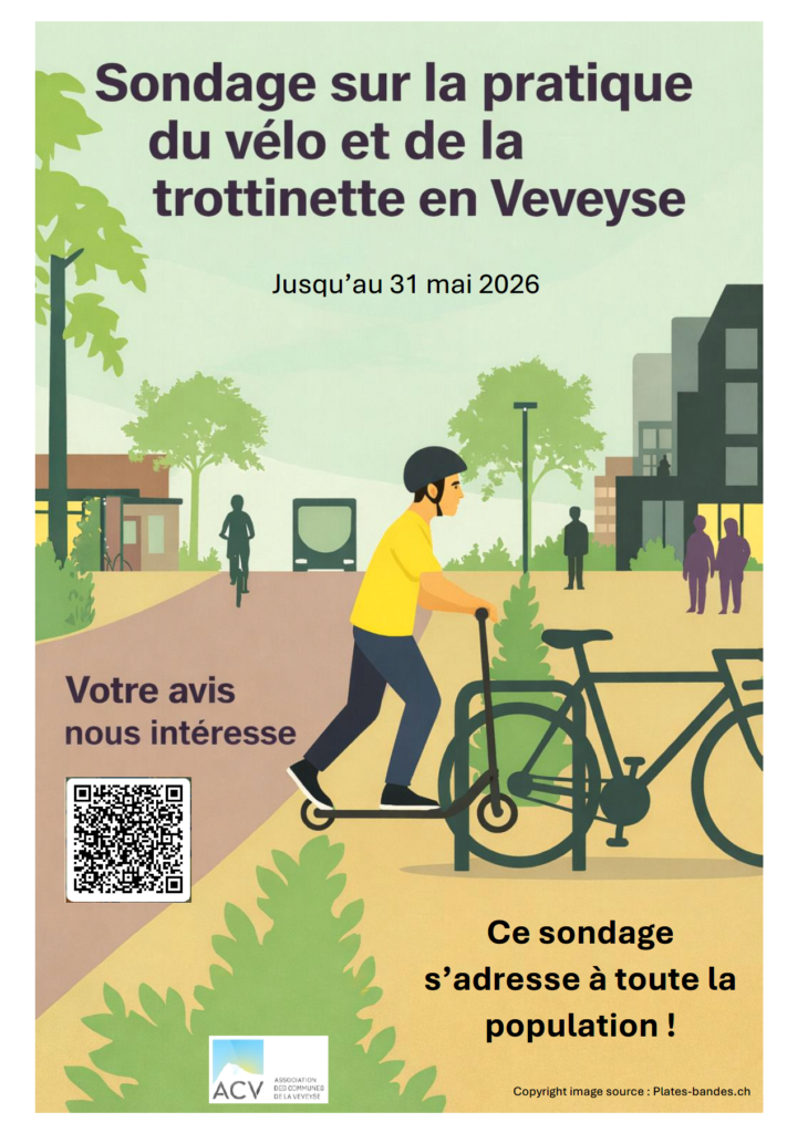 L’association des communes de la Veveyse lance un sondage à la population veveysane, sur la pratique du vélo et de la trottinette en Veveyse. Nous vous invitons à y participer en scannant le code QR situé au bas de l’affiche ci-après.